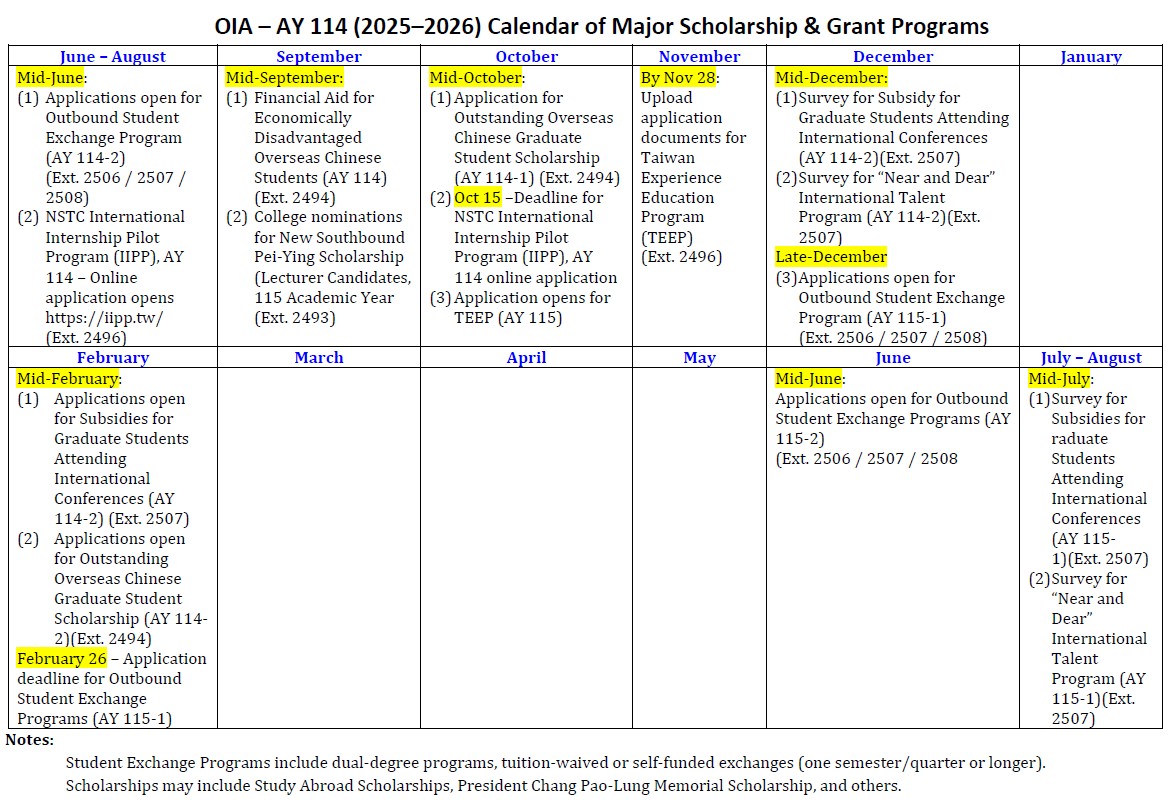 Application Schedule for Major Scholarship and Grant Programs